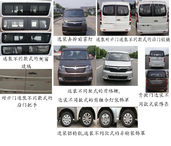 | 备注 | 带IUPR;选装去掉前雾灯;选装铝轮毂,选装不同款式的车轮装饰罩;选装不同款式的侧窗玻璃;选装对开门;ABS型号:WS100,WX80,生产厂:浙江万向精工有限公司;ESC型号:WS100,生产厂:浙江万向精工有限公司;发动机净功率80kW;选装不同款式的前格栅;背掀门后门选装不同款式装饰条;对开门选装不同款式的后门铰链和后门把手;选装不同款式的前组合灯装饰罩;8、9人座最后一排座椅可以折叠翻转.DAM15KL型发动机油耗值为8.4L/100km.195/70R15C轮胎负荷指数104.安装限速装置,限速100km/h.选装卫星定位系统. | ||