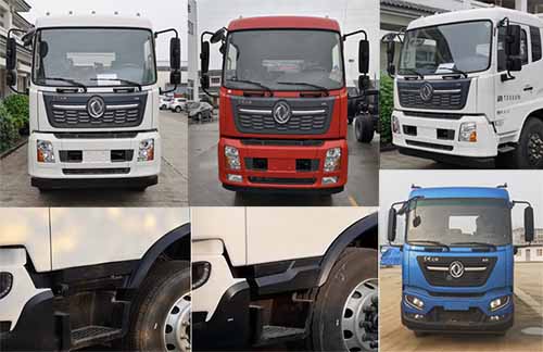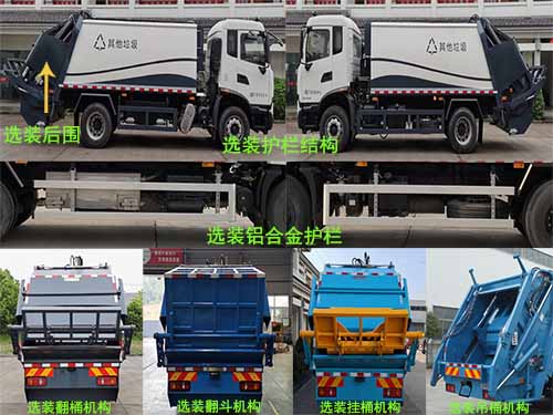 | 备注 | 1.该车为垃圾收集转运专用车辆,专用装置由垃圾箱体、上料机构等组成;2.随底盘选装驾驶室外观;3.选装侧面裙边结构(宽2550mm),选装后围,选装不同上料机构,后伸分别为320mm,590mm,由选装引起质量变化和长度变化,前悬1400mm对应轴距/后伸/整车长度分别为(mm):4500/0/8440,4500/320/8760,4500/590/9030,3950/0/7890,3950/320/8210,3950/590/8480;前悬1430mm对应轴距/后伸/整车长度分别为(mm):4500/0/8470,4500/320/8790,4500/590/9060,3950/0/7920,3950/320/8240,3950/590/8510;3.侧防护材质为Q235(选装铝合金材质),螺栓连接;后下部防护由专用装置替代,最大离地高度为500mm;4.安装具有卫星定位功能的行驶记录仪;5.发动机D4.5NS6B190,D6.7NS6B230,DDi50E190-60,B6.2NS6B210,B6.2NS6B230,DDi50E220-60油耗值(L/100km)分别为: 24.4,23.7,23.9,23.8,23.8,25.1;6.安装ABS型号/生产厂家:3631010-C2000/东科克诺尔商用车制动系统(十堰)有限公司,ABS 8/东科克诺尔商用车制动系统(十堰)有限公司,4460046450/威伯科汽车控制系统(中国)有限公司。 | ||