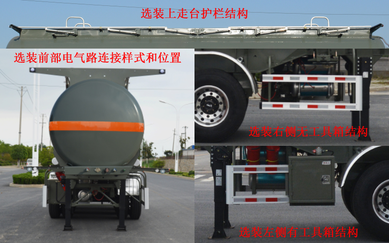 | 备注 | 罐体有效容积17.5立方米,罐体外形尺寸为(长mm×直径mm):9540×1580,危险货物运输车辆的类型为:AT型车辆;危险化学品类项号:8;其中整备质量中7550kg为备案参数中轻型行走结构,对应额定载质量为32450kg,选装上走台护栏结构,前部电气路连接样式和位置,右侧无工具箱左侧有工具箱结构;ABS系统控制器生产企业:广州瑞立科密汽车电子股份有限公司,ABS系统控制器型号:CM2XL-4S/2M,选装ABS系统控制器生产企业:威伯科汽车控制系统(中国)有限公司,ABS系统控制器型号:4005000880.侧后防护材质均为铝合金,连接方式均为螺栓连接式,后防护离地高度为500mm,后部防护装置的断面尺寸(mm):130×65. 采用适用于牵引危险品半挂车的牵引车. | ||