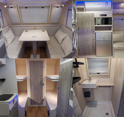 | 备注 | 中置轴挂车的牵引杆深入量(mm):40;中置轴牵引杆连接器最大负荷(kg):100;车厢顶部封闭且不可开启;其他说明:该车非乘用车,行驶过程中不载人;可选装侧遮阳棚,不安装侧遮阳棚时车宽为2300mm,车顶可选装太阳能板、天窗、换气扇,顶部不安装太阳能板、天窗、换气扇时整车高度2495mm,车身可粘贴不同颜色的图案和贴画;厢体内部布置有床,沙发,卫浴和厨具等,用于旅居宿营; | ||
