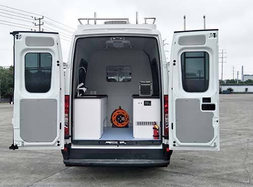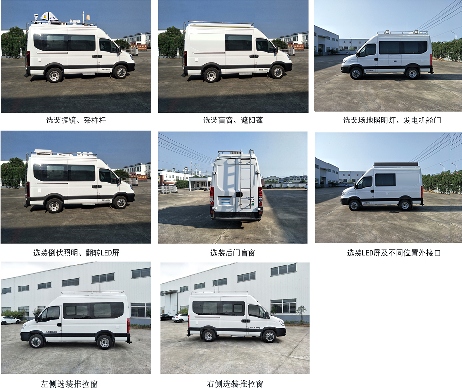 | 备注 | ABS型号:BOSCH ABS9、BOSCH ESP9;ABS生产企业:BOSCH公司;发动机净功率值:93KW;选装描述:随原车选装轮罩时整车宽度为2022mm,选装铝合金车轮时整车宽为2040mm,整车高度对应关系:至车顶高度为2735mm;安装车顶平台护栏时高度为2930mm;安装折叠式LED屏时高度为3220mm;安装车顶采样设备时整车高度为3410mm;可取消车顶平台、车顶护栏、后爬梯、市电空调、换气扇;选装振镜、采样杆,选装盲窗、遮阳蓬,选装场地照明灯、发电机舱门,选装倒伏照明、翻转LED屏,选装后盲窗,选装LED屏及不同位置外接口,选装左侧、右侧推拉窗,选装不同形式盲窗及推拉窗,选装车顶喇叭;侧后防护情况:侧面防护及后下部防护装置为整体式结构,后下部防护装置离地高度:340mm;专用功能及装置:该车装备供电设备、实验工作台、食品采样工具箱,用于快速检测; | ||