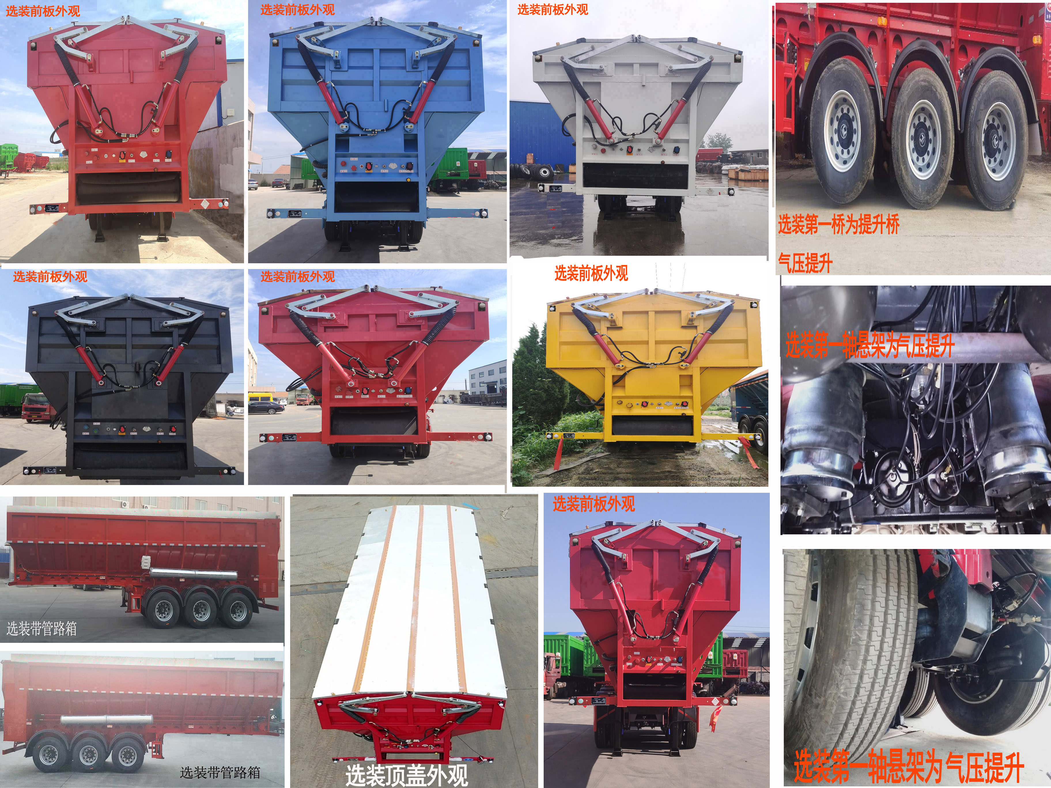 | 备注 | 该产品不能举升自卸,无自卸举升装置;ABS型号:CM2XL-4S/2M,HNABS4S/2m-4S/4m;ABS生产企业:广州瑞立科密汽车电子股份有限公司,山东海纳汽车科技有限公司;选装部件名称及其相关描述:该车顶部用硬质环保盖封闭;顶盖可开启,开启方式分为液压式或机械式。选装顶盖样式。后门不可整体开启;选装后门外观。用于散装粮食运输。卸货方式为传送带传送;车厢底部中间为橡胶传送带结构,用于清理粮食。选装边板外观。选装带和不带管路箱。选装前板外观。选装内部尺寸高。选装车辆第一轴为可提升桥,仅允许空载状态下提升。选装引起整备质量的变化小于3%;所用材料材质、连接方式以及后部防护装置的主要尺寸参数(断面尺寸和离地高度):侧防与车架为螺栓连接,后防护为焊接,后下部防护装置断面尺寸:140×60mm,离地高度490mm;自卸方式为传送带式;有可提升桥;第1桥;其他说明:外形尺寸长/货箱长/轴距/后悬对应关系为:9500/9100/3710+1310+1310/1970;9000/8600/3680+1310+1310/1500;8500/8100/3380+1310+1310/1300; | ||