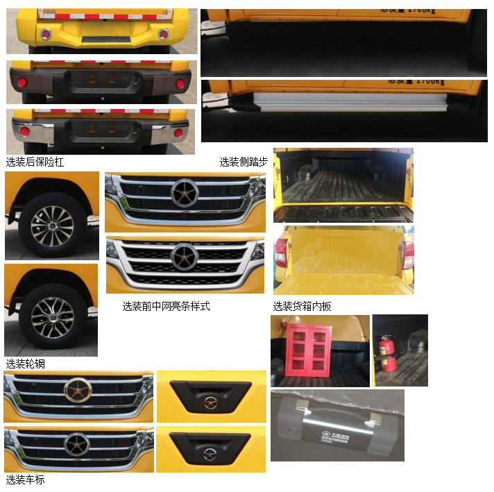 | 备注 | ABS型号:WX80;ABS生产企业:浙江万向精工有限公司;发动机净功率值:150kw;选装部件名称及其相关描述:选装后保险杠,侧踏步,轮辋,货箱内板,中网样式,车标,当选装货箱内板时,货箱内部最大尺寸为1497mm×1499mm×1180mm;选装后保险杠时整车长为5219mm,前悬/后悬为905mm/1214mm;车厢顶部封闭且不可开启;专用功能及装置描述:装逆变器、灭火器,选装工具箱,适用于一般工程作业的要求;其他说明:该车型可选装ETC车载装置,专用装置见选装照片; | ||