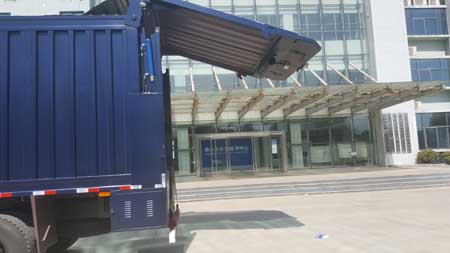 | 备注 | 该车顶部封闭,不可开启;卸货方式为液压马达带动链条和传送带卸货。车厢底部中间为橡胶传送带结构,用于清理垃圾。该车选装内部尺寸高2400mm,2200mm,2000mm三种高度,对应驾驶室高为3090mm的整车外形尺寸高分别是3950mm,3750mm,3550mm;对应驾驶室高为3760mm的整车外形尺寸高分别是3950mm,3760mm,3760mm。随底盘选装驾驶室。 选装后门开启方式:对开门或者是整体后门开启。选装引起的质量变化小于3%。侧面防护装置所用材料材质为Q235A,连接方式为螺栓连接;后部防护装置所用材料材质为Q235A,连接方式为螺栓连接,断面尺寸为140mm×50mm,离地高度为490mm。ABS系统型号:CM4XL-4S/4M,生产厂家:广州科密汽车电子控制技术股份有限公司。安装具有卫星定位功能的行驶记录仪。 | ||