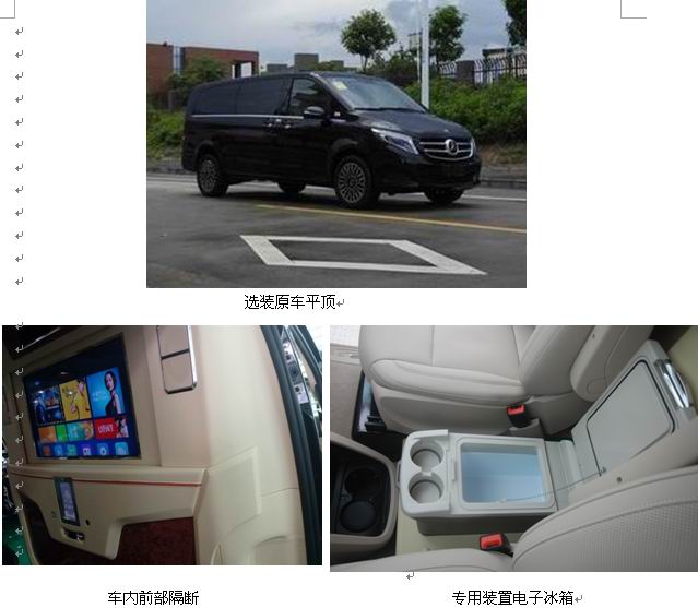 | 备注 | 配置:1500W220伏逆变供电系统、18L车载冰箱,车顶天线、前部隔屏上装影视系统1.带OBD;2.ABS厂家:博世汽车部件(苏州)有限公司,ABS型号:ESP9;选装:外装饰顶、原车带行李架、原车不装行李架、侧踏步,随原车选装:侧装饰件、前后灯装饰件等。装车顶卫星天线2100mm、选装外装饰顶时车辆高度2085mm,选装带行李架时车辆高度是1920mm,选装不带行李架时车辆高度是1880mm, 4人座时整备质量为 2580kg。专用装置见选装照片。 | ||