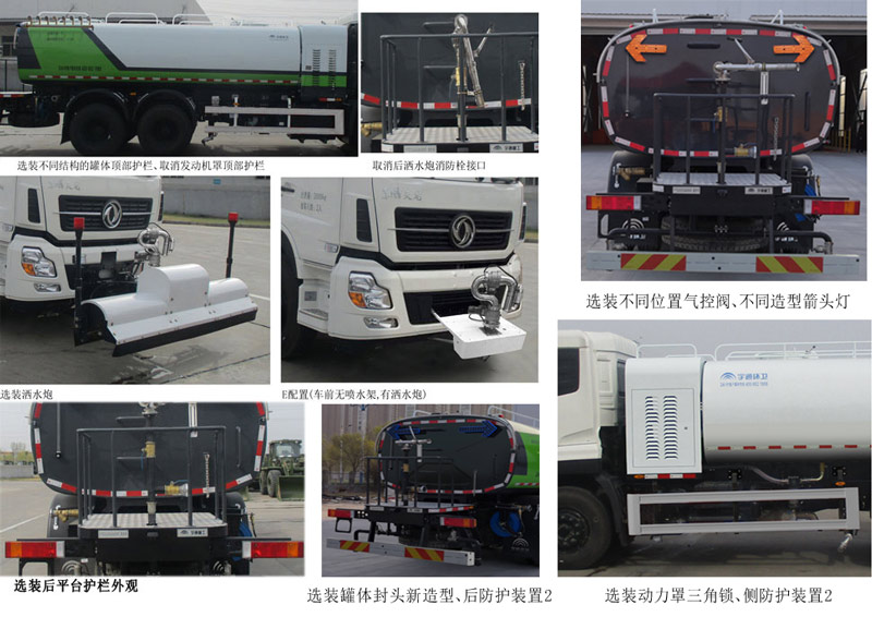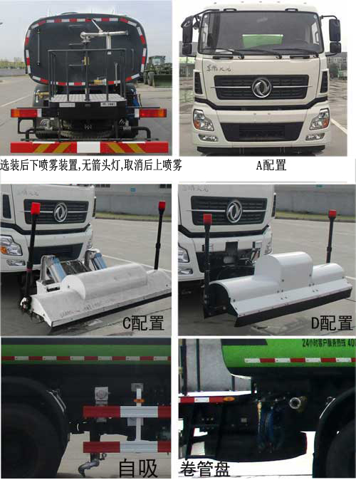 | 备注 | 1、该车型罐体有效容积13.3立方米,介质名称:水,密度:1000千克/立方米,该车有两种罐体,平头封头罐体外形尺寸(长X长轴X短轴)为5600×2400×1400(mm),胀形封头罐体外形尺寸(长X长轴X短轴)为5700×2400×1400(mm)。2、该车型有5种配置:A(车前无喷水架),B(车前选装基础型喷水架1),C(车前选装喷水架2),D(车前选装喷水架3),E(车前无喷水架,有洒水炮);A配置时,整车长度为9900mm,接近角11°,整备质量为11950kg;B配置时,整车长度为10810mm,接近角10°,整备质量为12130kg,其中前伸为910mm;C、D配置时,整车长度为10940mm,接近角10°,整备质量为12130kg,其中前伸为1040mm;E配置时,整车长度为10500mm,接近角11°,整备质量为11950kg,其中前伸为600mm。3、该车型仅选用轴距4350+1350(mm)。4、驾驶室准乘人数/额定载质量的对应关系为:2/12740kg,12920kg,3/12675kg,12855kg。5、侧防护装置材料为Q345B,与车辆采用螺栓连接,后防护装置材料为Q345B,与车辆采用螺栓连接,截面尺寸为:150×60(mm),离地高度为:480(mm)。6,ABS型号/生产厂家分别为:3631010-C2000/东科克诺尔商用车制动系统(十堰)有限公司。7、可选装后下喷雾装置,取消后上喷雾装置,选装无箭头灯状态,自吸,卷管盘。8、该车装有罐体总成专用装置,用于清理路面、管道沉积物或清洗物体。9、可随底盘选装驾驶室前脸扰流罩、驾驶室顶灯、取消前雾灯等。10、该车由于加装了前喷水作业专用装置,故前下部防护不适用,不再加装。11、选装另外一种箭头灯,洒水炮支架,后上喷洒装置,罐体裙边,不同结构的罐体顶部护栏,前洒水炮。12、选装胀形封头罐体。13、可取消前鸭嘴、后洒水炮、后洒、副发动机罩顶部护栏、后洒水炮消防栓接口。 | ||