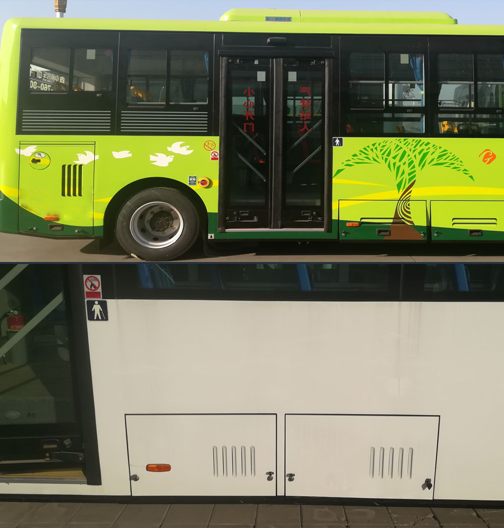 | 备注 | 1.可取消空调,取消空调时整车高为2950mm;2.选装高配时,整备质量为7350kg,额定载客为50/14-27或60/14-27;选装中配时,整备质量为7000kg,额定载客为50/14-27或60/14-27;选装低配时,整备质量为6600kg,额定载客为50/14-27或60/14-27;3.两侧可选装不同形式的边窗结构,4.可选装不同形式的后视镜;5.选装门上灯;6.选装轮罩轮眉;7.侧舱门可选装不同形式的散热孔或取消散热孔;8.可选装或取消侧舱门扣手;9.后舱门可选装或取消散热孔;10.后围可选装或取消后拖车钩门;11.可选装倒车监视器及其防护罩;12.允许外接充电;13.产品的技术阶段:发展期;14.储能装置种类/生产企业:磷酸铁锂动力蓄电池/合肥国轩高科动力能源有限公司;15.ABS制动系统型号/生产厂家:ABS-E/威伯科汽车控制系统(中国)有限公司或CM4XL-4S/4M/广州瑞立科密汽车电子股份有限公司;16.驱动电机额定功率为100kw,峰值功率为165kw;17.该车型使用的245/70R19.5轮胎的负荷指数为141/140;18.该车安装行车记录仪。 | ||