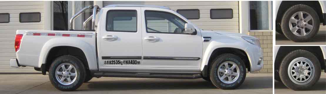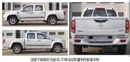| 备注 | 选装行李架,防滚架,侧踏,外绳钩,轮辋,前装饰杠,前雾灯,昼间行驶灯,中网,后部字标,不粘贴反光标识,不喷涂总质量和栏板高字样.ABS型号及生产企业:ABS9,ESP9/博世汽车部件(苏州)有限公司,GWM8/长城汽车股份有限公司,YF8/武汉元丰汽车电控系统有限公司.发动机净功率值为90kW. | ||