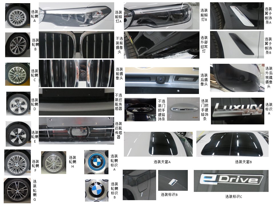 | 备注 | 选装轮辋, 选装前照灯A, B, 选装前摄像头, 选装后摄像头,选装外后视镜摄像头, 选装巡航传感器, 选装天窗A, B, 选装外部迎宾灯, 选装翼子板饰条A, B,选装门把手镀铬饰条, 选装标识A, B,C, 前后保险杠侧面选装传感器, 选装前后保险杠A, B, 选装立柱饰条A, B, 选装车窗饰条A, B, C, D, 选装进气格栅A, B, C,D, 选装前牌照板A, B,C,D,选装后保险杠镀铬条,选装前雾灯A,B,C,D,E,F,选装侧围A, B. 后轴标配空气悬架.功率值为最大净功率,额定功率为150kW. ABS系统型号:EBC460,生产厂:天合汽车零部件(上海)有限公司,储能装置为锂离子动力蓄电池(镍钴锰酸锂离子电池), 生产企业是华晨宝马汽车有限公司.允许外接充电.锂离子动力蓄电池技术阶段为发展期. | ||