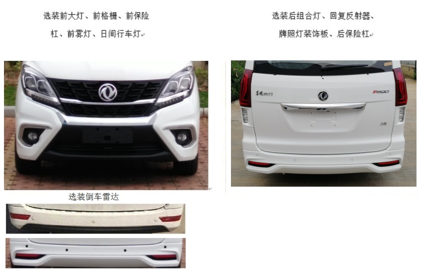 | 备注 | 发动机最大净功率为:95KW。ABS型号/企业:ABS B /博世汽车部件(苏州)有限公司、ESP B /博世汽车部件(苏州)有限公司。选装轮毂、选装天窗、选装后摄像头、选装外后视镜、选装尾部标识、选装前摄像头、选装门把手、选装无雨刮及无后窗加热丝、选装无后轮挡泥罩、选装前大灯、选装尾翼、选装无骨雨刷;选装前大灯、前格栅、前保险杠、前雾灯、日间行车灯;选装后组合灯、回复反射器、牌照灯装饰板、后保险杠;选装倒车雷达;第二排选装型号为DM5L-ZY-RP02座椅滑轨行程为406mm、第三排座椅靠背可折叠。 | ||