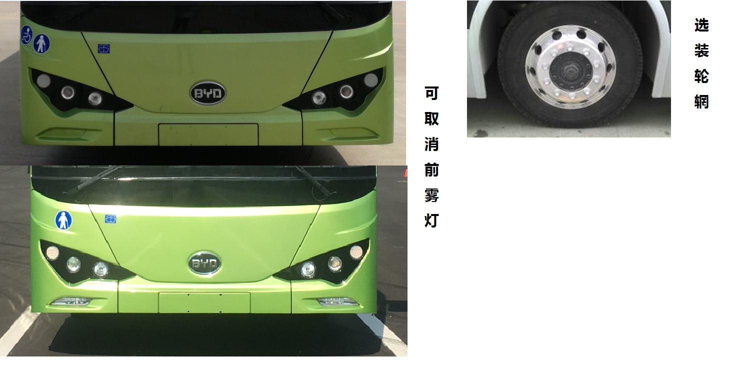 | 备注 | 1.选装轮辋,可取消前雾灯.2.动力蓄电池种类:磷酸铁锂蓄电池,电池单体生产企业:深圳市比亚迪锂电池有限公司,储能装置总成生产企业:汕尾比亚迪汽车有限公司.3.驱动电机类型:永磁同步电机,生产企业:长沙市比亚迪汽车有限公司,采用双轮边电机驱动,额定功率:75kW,峰值功率:100kW.4.ABS型号:ABS 8,生产企业:克诺尔商用车系统企业管理(上海)有限公司.5.可全国销售.6.该车型搭配275/70R22.5轮胎,对应负荷指数为152/148E、152/148F、152/148J、148/145J、148/145M.7.该车安装有带有卫星定位功能的行驶记录仪. | ||