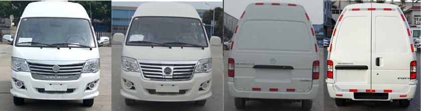 | 备注 | 1.顶盖可选装高顶(车高2260mm)、中顶(车高2066mm)、平顶(车高1980mm);2.选装另一款后视镜及前格栅;3.带OBD;4.选装另一款后保险杠;5.后部为盲窗;在座位的后方安装具有足够强度的板式隔离装置;货箱顶部封闭不可开启;6.可选装不同形式隔断;7.该车装ABS系统控制器的型号/生产企业:YF8/武汉元丰汽车电控系统有限公司;8.V22发动机最大净功率(kw):77,油耗申报值(L/100km):14.1. | ||