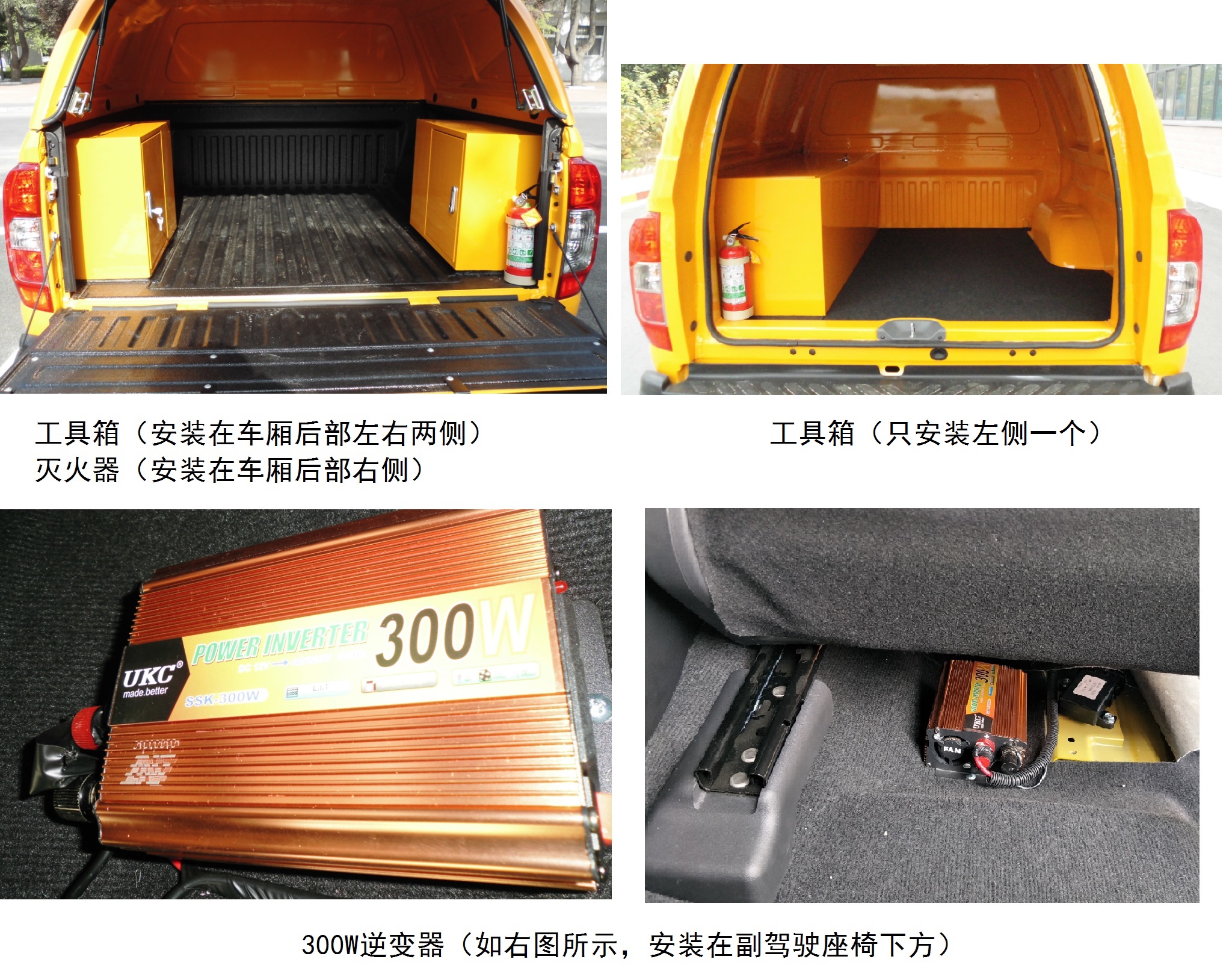 | 备注 | 装备灭火器、工具箱、300W逆变器工程作业用专用设备;选装移动电缆盘、搜索灯、锥筒,选装不同式样轮辋、不同规格前照灯,选装不同式样后泊车雷达,选装倒车影像、昼间行驶灯、后箱宝,选装不带侧踏板;ABS型号:EA5300,ESP9;ABS生产厂:博世汽车部件(苏州)有限公司,博世汽车部件(苏州)有限公司;发动机最大净功率105kW. | ||