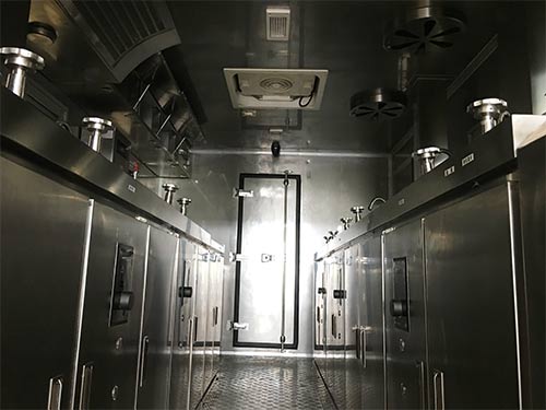 | 备注 | 1.车厢顶部封闭不可开启;2.该车用于烹饪食品,餐饮加工,车厢内部设备配备有发电机,冰柜,冷饮机,售货台,炊具等;该车装有空调,车顶装有水箱,护栏,车身前部装有爬梯;两侧和后部装有户外照明灯;前面可不选装爬梯,后部可选装爬梯,后部选装双开门;3.侧防和后防均采用:Q235A碳钢,侧面采用焊接加螺栓连接,后部为裙边结构下沿离地高500mm;4.ABS型号为3631010-C2000,生产厂家为东科克诺尔商用车制动系统(十堰)公司;5.随底盘选装驾驶室前脸。 | ||