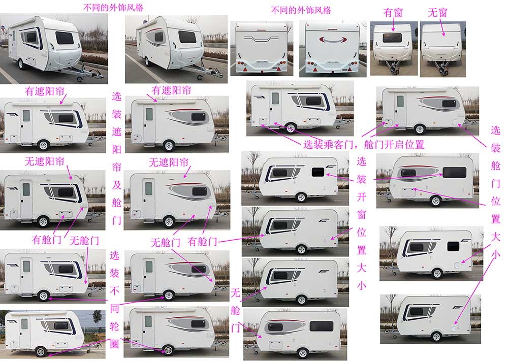 | 备注 | 1.车厢顶部封闭,不可开启.2.本车为非乘用车,行驶过程中不载人.3.牵引杆最大深入量为40mm.4.该车设有厨具,卧具,卫生设备,空调,冰箱等旅居用途的专用设施5.车身为裙边箱体结构,代替防护装置,离地高度455mm。6.空调,冰箱,遮阳帘为选装件。7连接器最大负荷为95Kg。 | ||