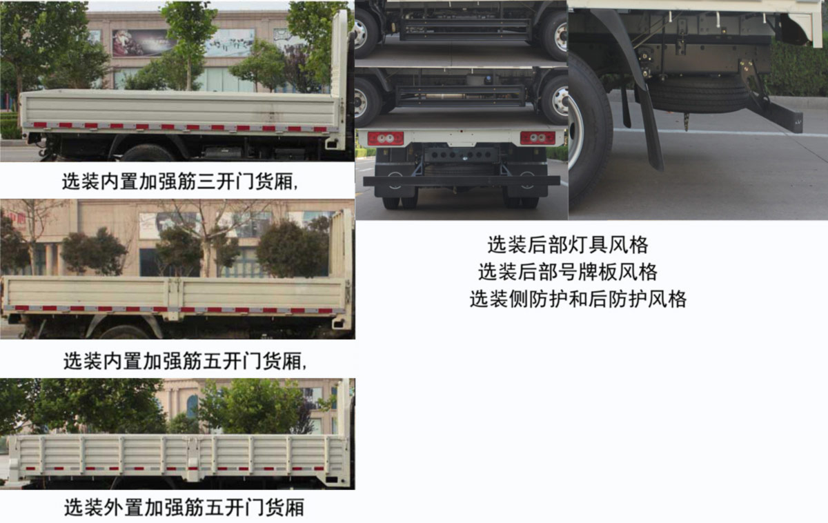 | 备注 | 侧面防护装置的所用材料材质为冷板B-2.0-GB/T708,后下部防护装置的所用材料材质为异型管20-D-1-100×50×3,支架材料为热板A-6/Q235A,连接方式为螺栓连接,位置不可调整,后部防护装置的断面尺寸为100×50mm,离地高度为475mm.ABS型号为CM4XL-4S/4M,生产厂家为广州瑞立科密汽车电子股份有限公司,发动机YNF40E1对应油耗值分别为12.3,选装新前围及前部灯具,选装侧围附件,可选装后部灯具,可选装后部号牌板风格.选装内置加强筋三开门货厢,选装内置加强筋五开门货厢,选装外置加强筋五开门货厢,可选装侧防护和后防护风格.选装的侧防护材料为冷板B-2.0-GB/T708,后防护材料为异型管20-D-1-100×50×3,离地高度为495mm. | ||