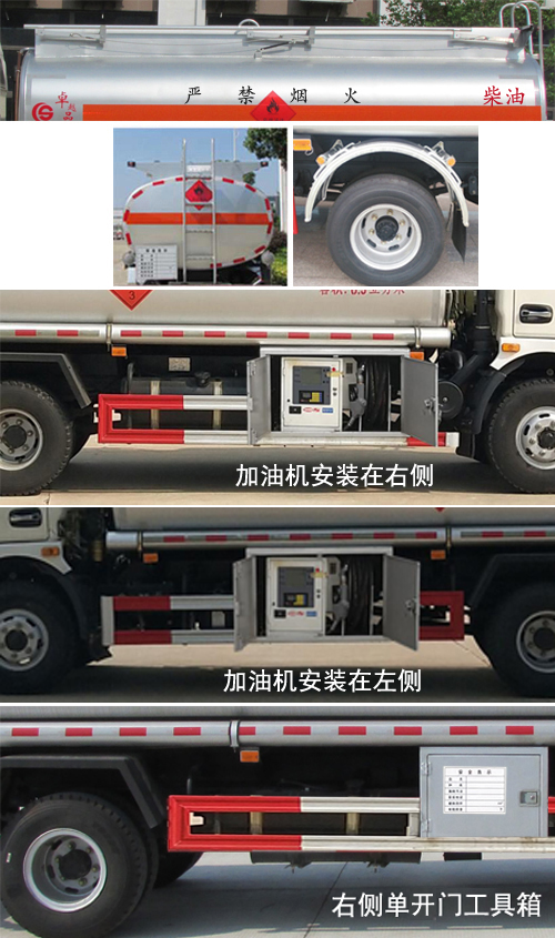 | 备注 | 1,该车适用于危险品运输,运送危险货物车辆类型为:FL型。运输介质:柴油,汽油,密度:830,700千克/立方米,类项号:3;罐体有效容积8.3立方米;罐体外形尺寸(长×宽×高)(mm): 4800×2000×1280(加油机装置外装在车架左侧或右侧,安装位置可前后变化)。加油机型号及生产企业:BL1111Z/珠海市贝林加油设备有限公司中山分公司,HS1812B/托肯恒山科技(广州)有限公司,SKES-1112/恒和嘉华科技有限公司(上海伯莱机械有限公司),SK20QF-111A、SK20QF-222A/郑州三金石油设备制造有限公司,CS20D1110F/正星科技有限公司,JSK-70B1121CZ,JSK-70B1121C,JSK45B1121C/稳恩佳力佳(北京)石油化工设备有限公司, ZH6444/佛山市众泽机电科技有限公司, XTST121BF1/邢台正润通科技发展有限公司,TA-1111KFJ/沈阳航天新阳机电有限公司。2,侧防护采用冷弯型钢/Q235,螺栓连接。后防护采用冷弯型钢/Q235,焊接,截面高350mm,截面宽50mm,下边缘离地高500mm。3,罐体上部选装无上走道,选装弧形挡泥板,选装右侧单开门工具箱。随底盘选装驾驶室,仅选用排气管前置、限速装置(限速80km/h)、前轮盘式制动及子午线轮胎的底盘,安装带有卫星定位功能的行驶记录仪。ABS型号为3631010-C2000,生产厂家为东科克诺尔商用车制动系统(十堰)有限公司。 | ||