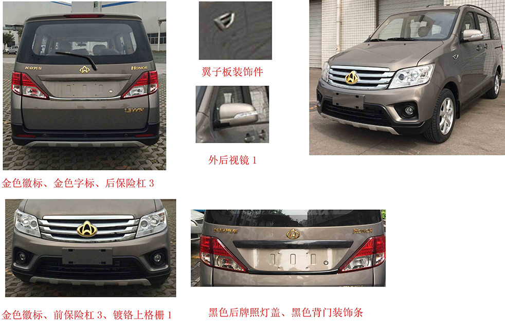 | 备注 | 选装(金色徽标、金色字标、翼子板装饰件、后部字标"HONOR"、前保险杠1、后保险杠1、前保险杠2、后保险杠2、前保险杠3、后保险杠3、倒车雷达、ABS、黑色上格栅、镀铬上格栅、镀铬上格栅1、后雨刮、行李架、侧围护板、后回复反射器、驾驶员安全气囊+副驾座安全气囊、钢车轮、前雾灯、车体同色背门装饰条、黑色背门装饰条、黑色后牌照灯盖、黑色外后视镜、外后视镜1、后组合灯、车轮装饰盖、铝合金轮辋、轮心盖、黑色窗框贴膜)。后悬架选装螺旋弹簧。选装行李架时整车高度为1850mm。后悬架选装螺旋弹簧时总质量为1850kg。发动机最大净功率为72kW,ABS系统控制器型号:F7ZB000B10,ABS系统控制器生产企业:博世汽车部件(苏州)有限公司。选装双气囊时对应VIN:LS4ASH2EXXXXXXXXX。 | ||
